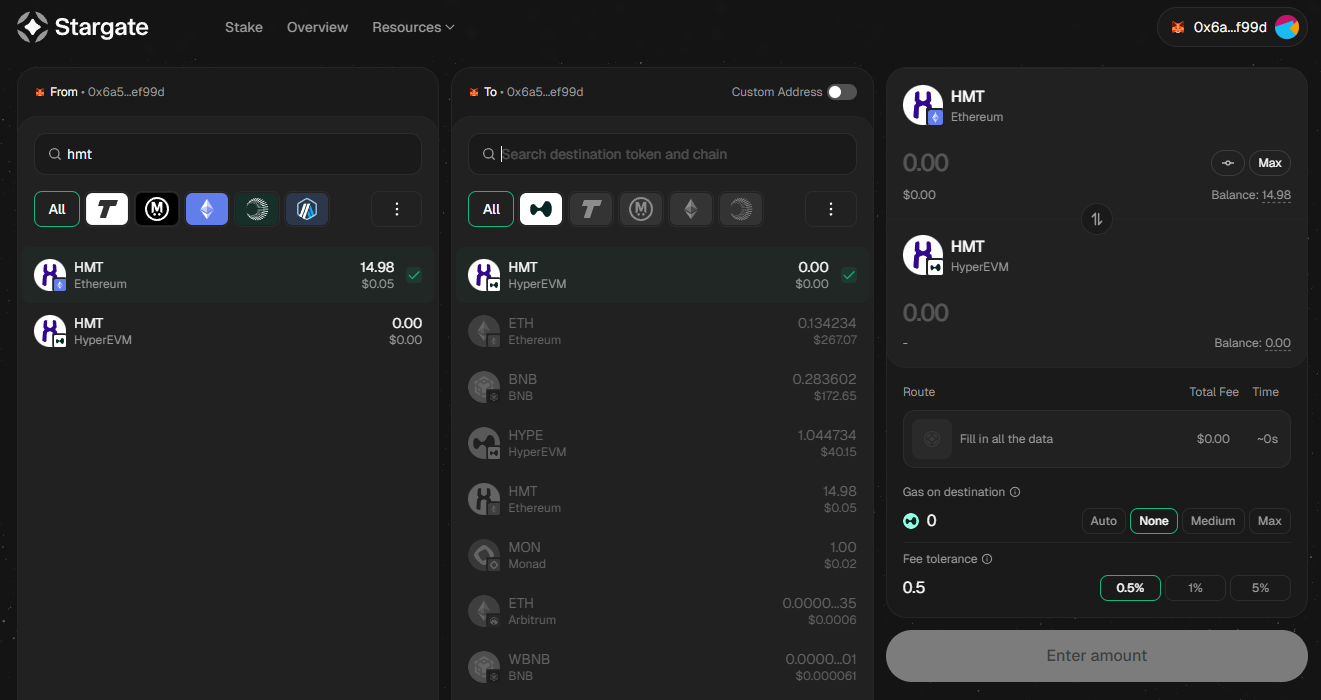 Enter the amount of HMT you want to bridge. Stargate will show the destination amount, route, estimated fee, and estimated time.