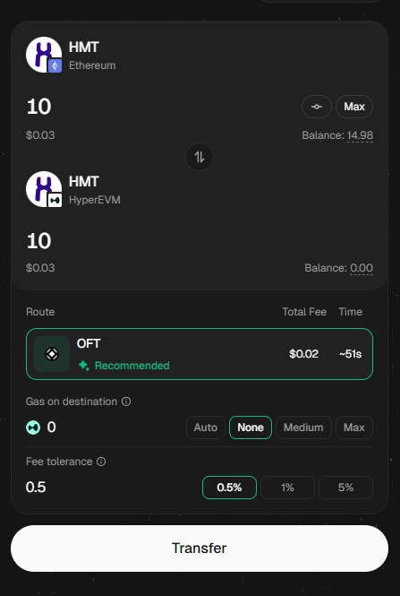 At HUMAN, HMT can be transferred between Ethereum and HyperEVM through Stargate Finance. Stargate uses LayerZero messaging to move supported assets across chains with a simple approval and transfer flow.