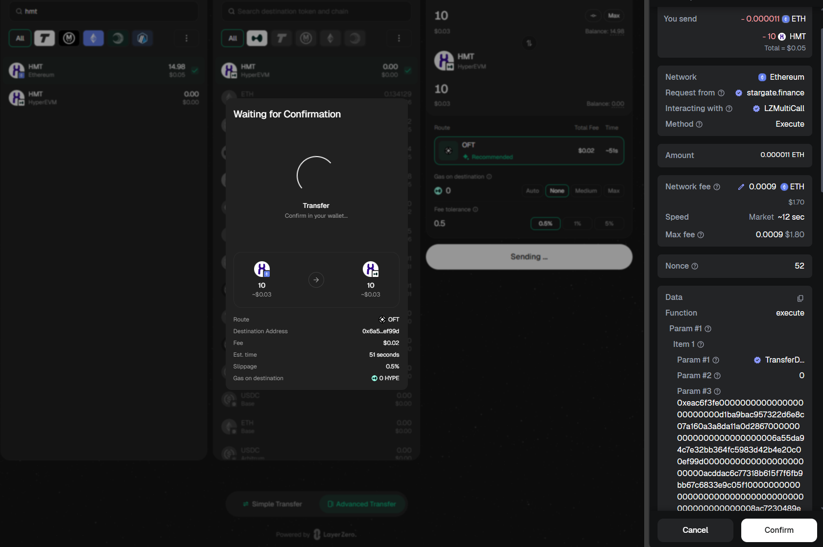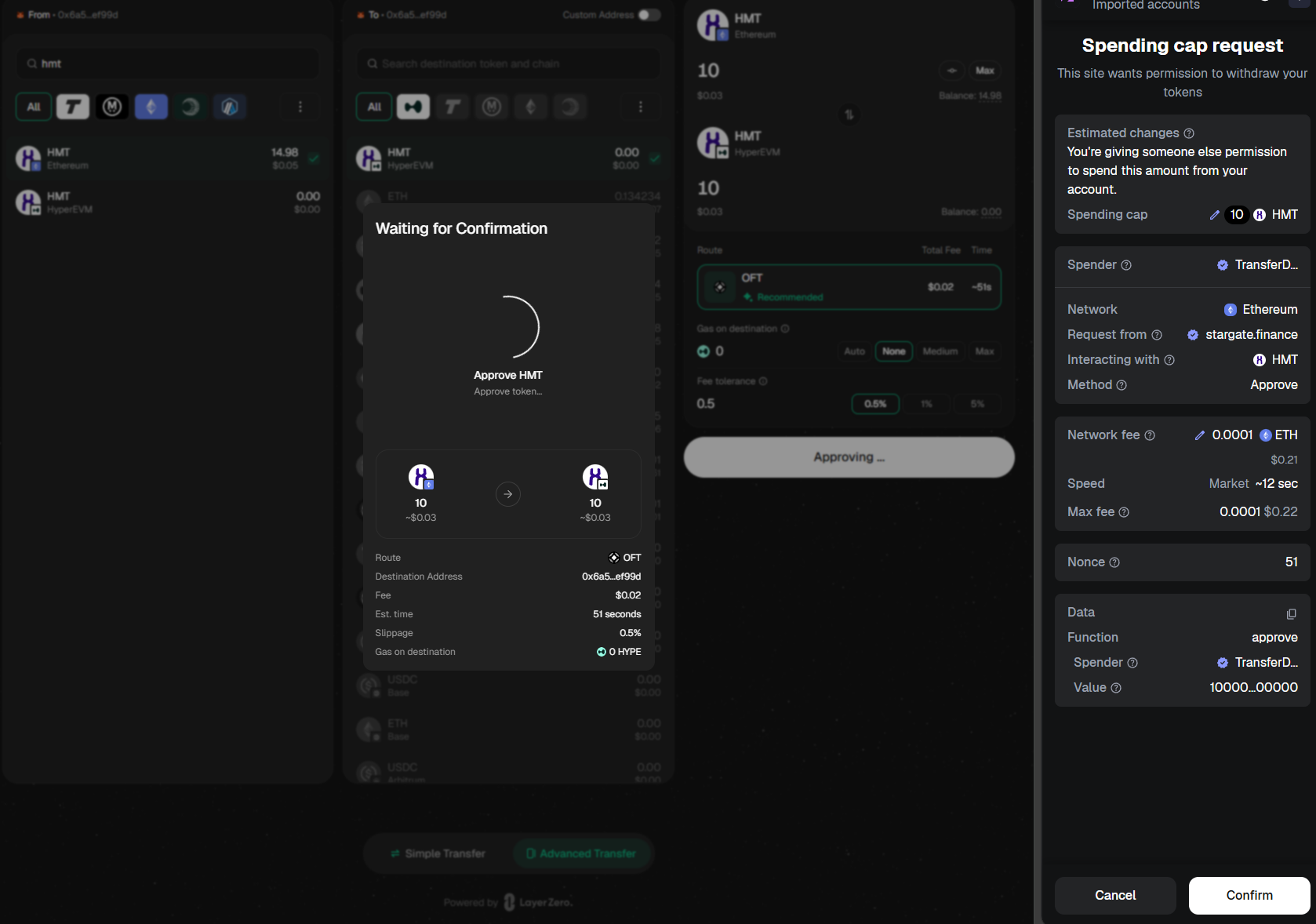 - Click Transfer. If HMT has not been approved before, Stargate first asks for an approval transaction.