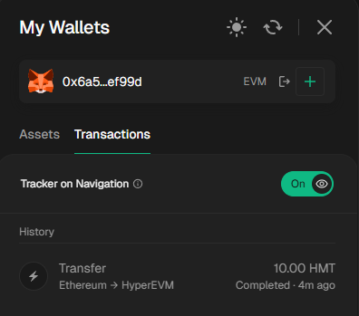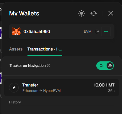 Wait for the transaction to be processed. Your wallet activity should show a transfer from Ethereum -> HyperEVM.